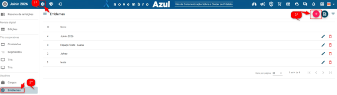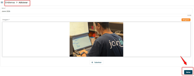 Como criar Emblemas na Joinin Para adicionar um emblema na plataforma da Joinin seguir o passo a passo abaixo: Configuração > Emblemas > Adicionar > Salvar