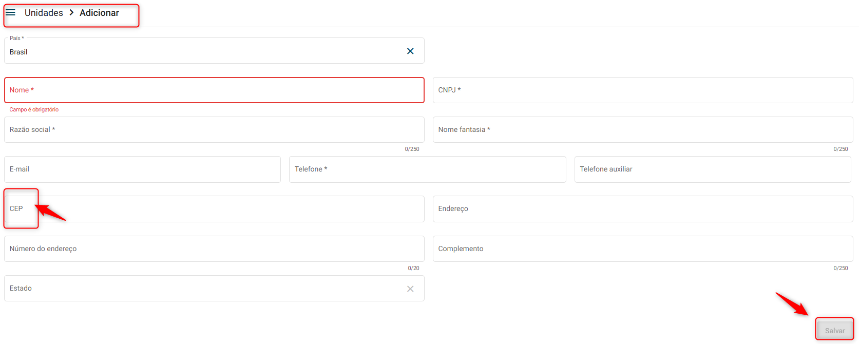 Configuração > Unidades > Adicionar > Salvar.
