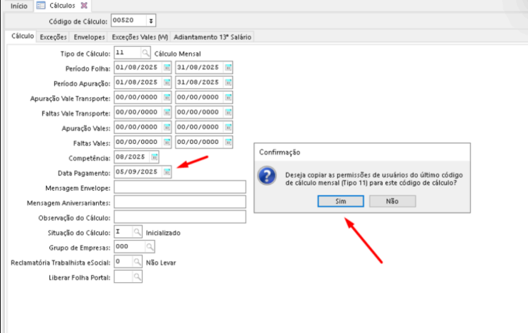 “Deseja copiar as permissões de usuários do último código de cálculo mensal (Tipo