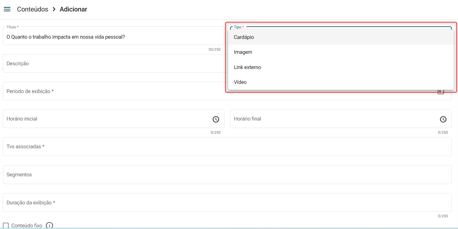 Preencher as informações conforme necessidade, o tipo de documento que será exibido pode ser cardápio já criado, imagem, link externo ou vídeo.